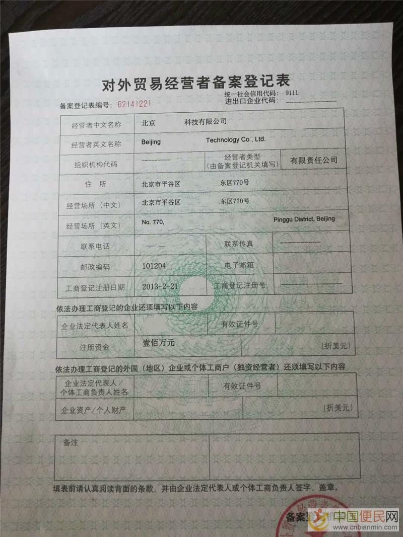 北京通州区对外贸易经营者备案登记初次办理的准备手续: